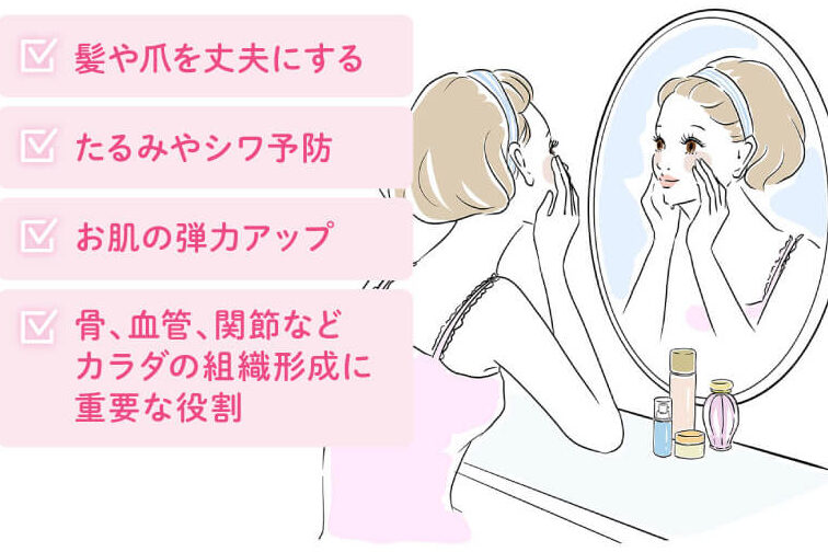 - 亜鉛: 細胞分裂と再生を助けるため、皮膚や結合組織の健康維持に寄与。