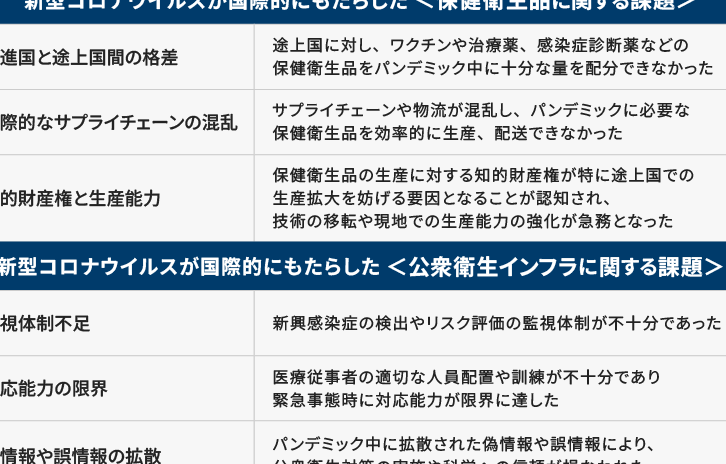- ワクチン開発促進: 新型コロナウイルスワクチン開発時の迅速な対応から学び、新しいワクチン技術への投資を増加させる。