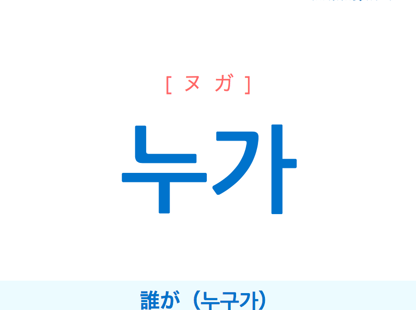 - 誰 (だれ): 日本語で一般的に使われる「誰」は、「누가」に非常に近い意味を持ちますが、より広範なシチュエーションで使用されることが多いです。「누가」と比べて、単純な質問として用いる場面が多いため、カジュアルさが際立ちます。