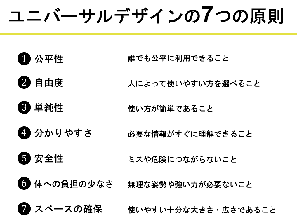 ユニバーサルデザインにはいくつかの基本原則があります。それらは以下の通りです: