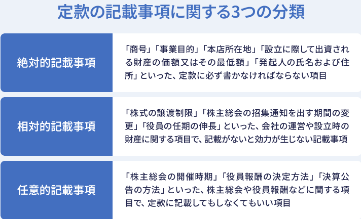 定款にはいくつかの主要な要素があります。これらを把握することで、企業運営における役割とその重要性が明確になります。