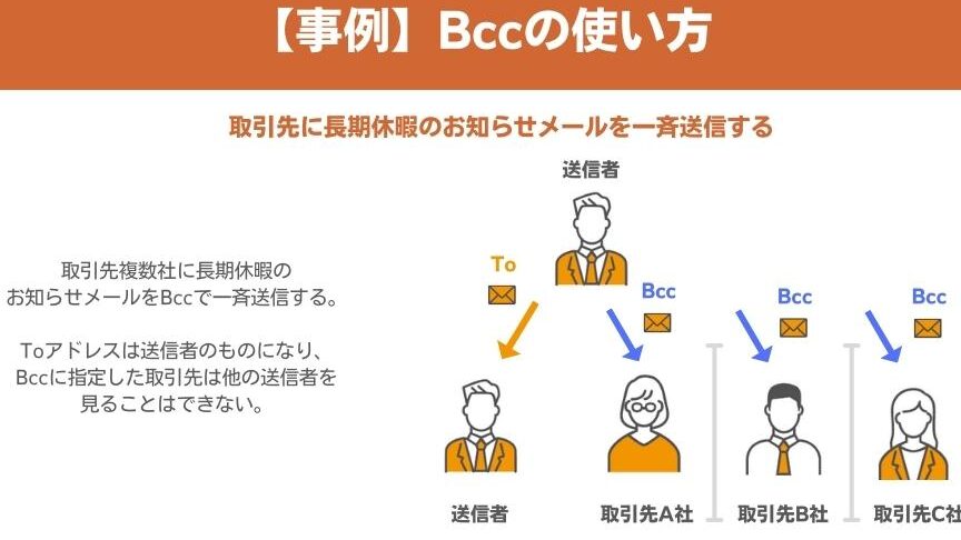 - BCC: BCC欄に記載されたメールアドレスは他の受信者には表示されず、そのためプライバシーを保持する必要がある場合や、大人数への一斉送信時によく利用されます。