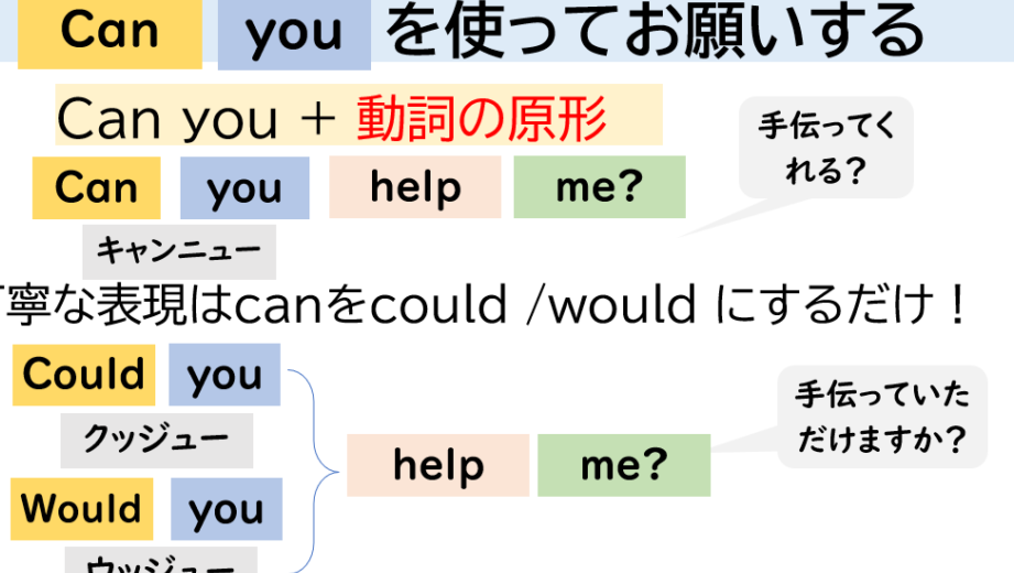 | 友人へのお願い | “Can you please help me with this project?” (このプロジェクトで手伝ってもらえますか?) |