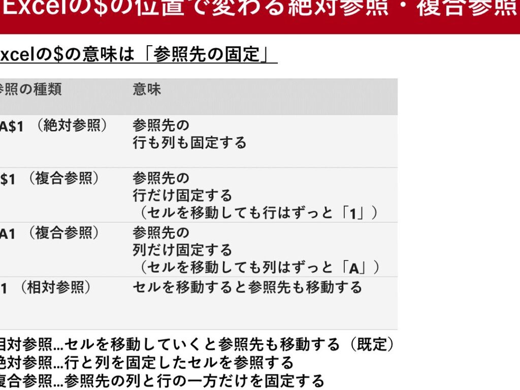 - 絶対参照: セルの行番号や列番号が変わらないようにするため、「$」を使います。例えば「$A$1」とすると、どこに数式をコピーしても常にA1セルを指し示します。