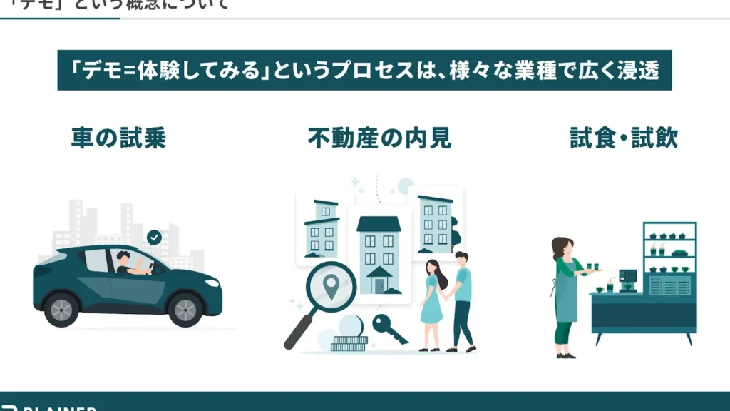 ビジネス環境では、新製品やサービスを市場へ導入する際、多くの場合デモンストレーションが行われます。この方法は顧客との信頼関係構築にも寄与し、販売促進につながります。具体例として、