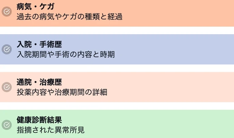 具体的には、以下のような項目が既往歴として記録されます: