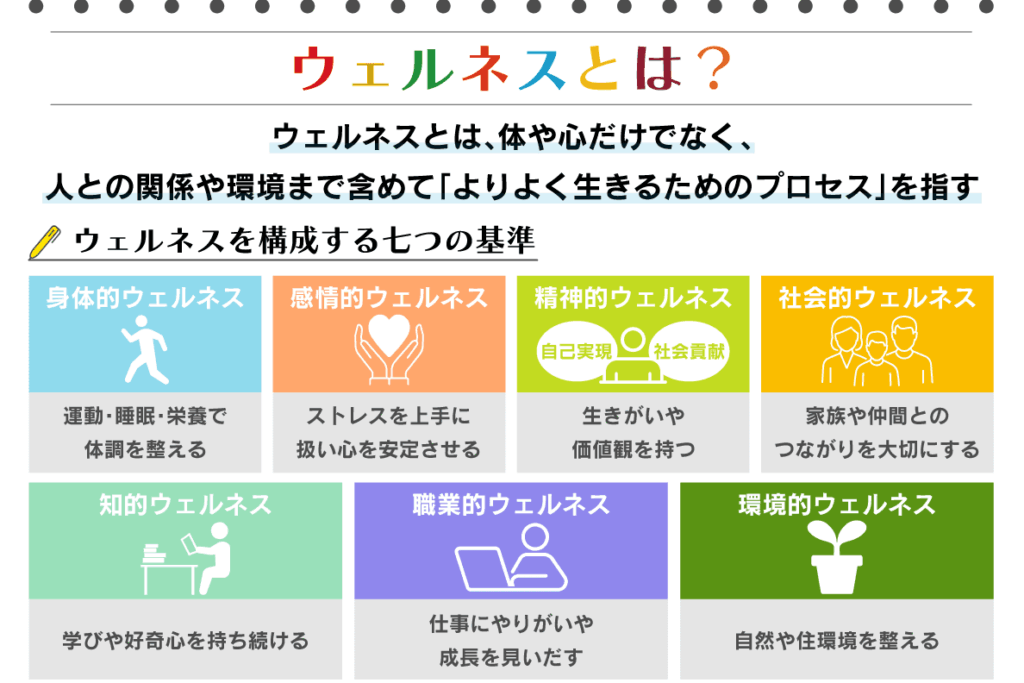 - 身体的ウェルネス: 適切な食事と定期的な運動が体力や免疫力を高めることに寄与します。