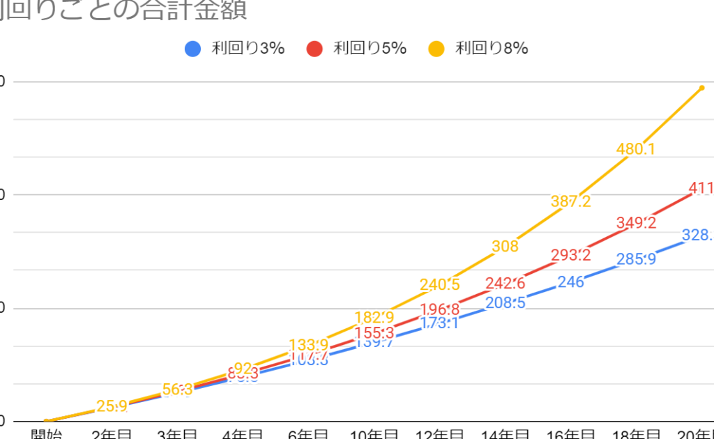 | 月間投資額 | 20年後総資産(約) | 年間リターン率(仮定) |