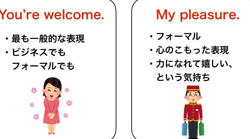 - 初対面の人との交流: 知らない人から「助かりました」と感謝された時には、「ユアウェルカム!気軽に声をかけてください」と返すことで良好な印象を与えられます。