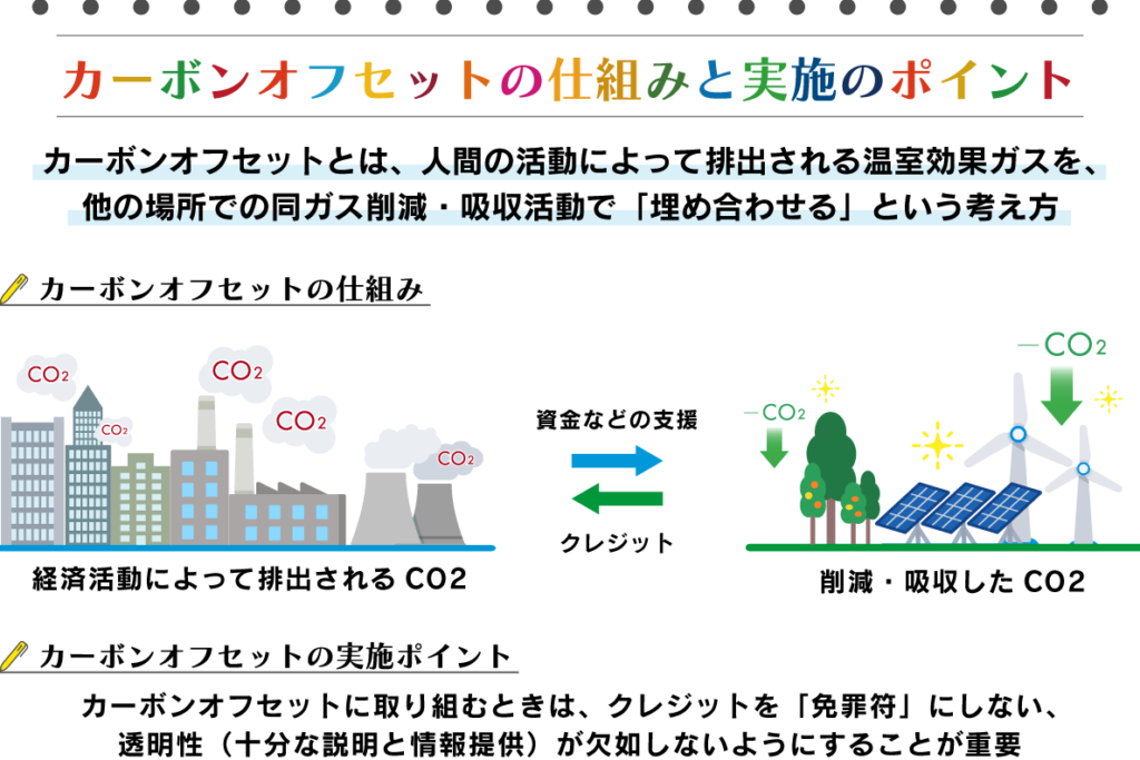 - 環境負荷軽減: 企業は製品生産過程で発生する排出物を削減し、その分再生可能エネルギーへの投資などで相殺します。