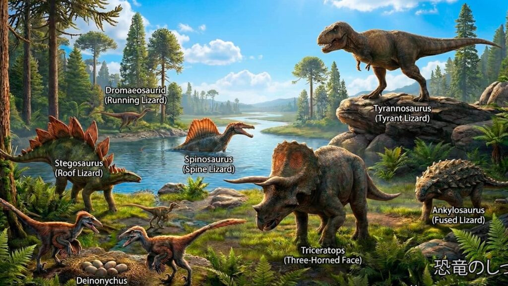 各種恐竜名には、その形状や行動、生息環境から派生した意味があります。例えば、