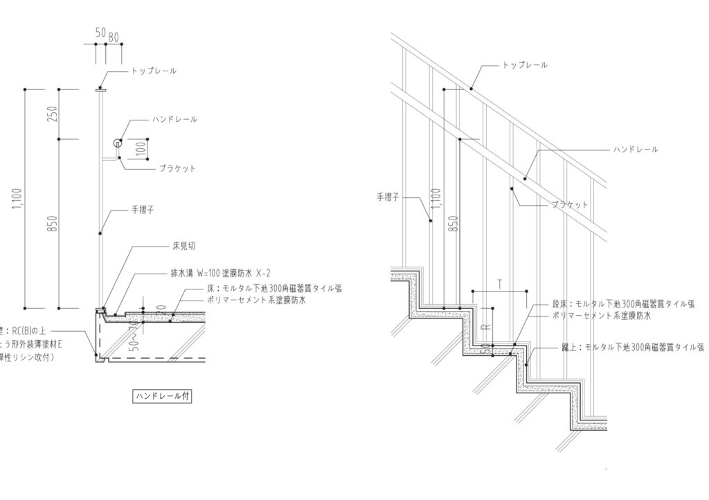 - B型手すり: 壁側についているものですが、一部露出した部分への滑り止め加工は必須となります。