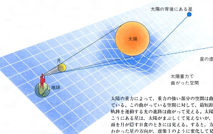 - 光路の曲げ: 光も時空に沿って曲がるため、大きな質量を持つ天体周辺で光が屈折します。